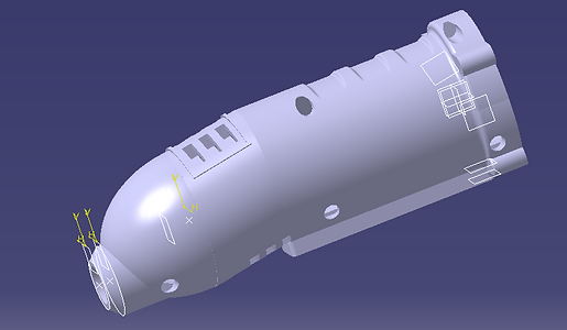 Vu que la coque possède plusieurs axes inclinés, il faut créer plusieurs plan inclinés et esquisser sur eux pour que son apparence soit plus proche que la pièce. En plus, elle contient plusieurs formes comme par exemple le cylindre, la sphère, la tube ainsi que la forme spéciale qui sont liées l'un et l'autre, nous avons utilisé l'extrusion jusqu'à la surface ou coupé l'un sur l'autre pour obtenir cette partie.